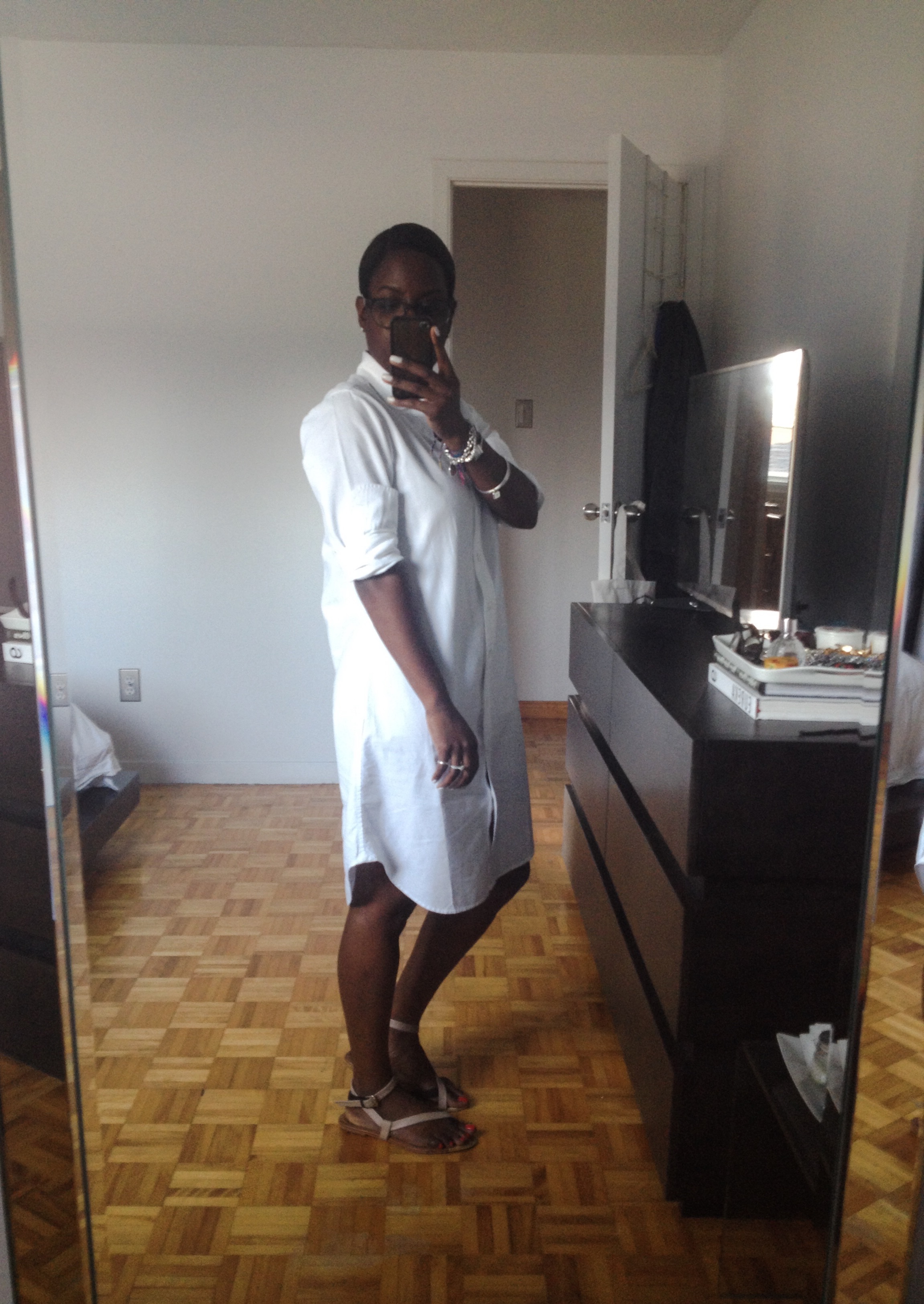 As for the shirtdress: I had been on a never-ending quest to find the perfect one when I saw this one at UNIQLO last year in New York. In the past, the ones I had either seen or bought were always belted, too short, too feminine, too pretty, in the wrong color, made out of the wrong fabric, etc. Basically, they were all wrong. And then, this one came into my life… much to the chagrin of my dear husband: “It looks like something I could have made in my grade 9 Home Economics class.” See, the husband and I have diverging ideas on what I should wear. While I fancy myself a 5’11” Russian model, which means that I’m often drawn to boxy, shapeless forms, he sees me as I truly am – a 5’1″ Haitian woman, which means that anything Beyoncé wears, he wants me wearing! Anyhow, I won that particular battle: the shirtdress was perfect – so I bought it. And to make him forget that I’m wearing a glorified potato sack – as he puts it – sometimes, I wear it with heels. And bam! all is forgiven.